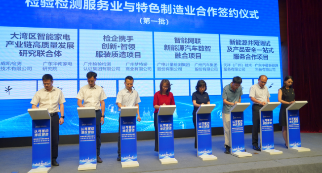 活动上,8家检测认证机构与制造业企业进行签约,已毕政策互助。其中,广检集团与广州梦特娇的检企联袂革命·智领服装质造表情,广州质检院与广州浩洋电子的互助表情成为首批两业会通优秀案例,这些互助案例突显了“番禺有盘算”在产业链要津设施的技艺镶嵌智力,展现了磨真金不怕火检测与制造业深度会通的施行后果。